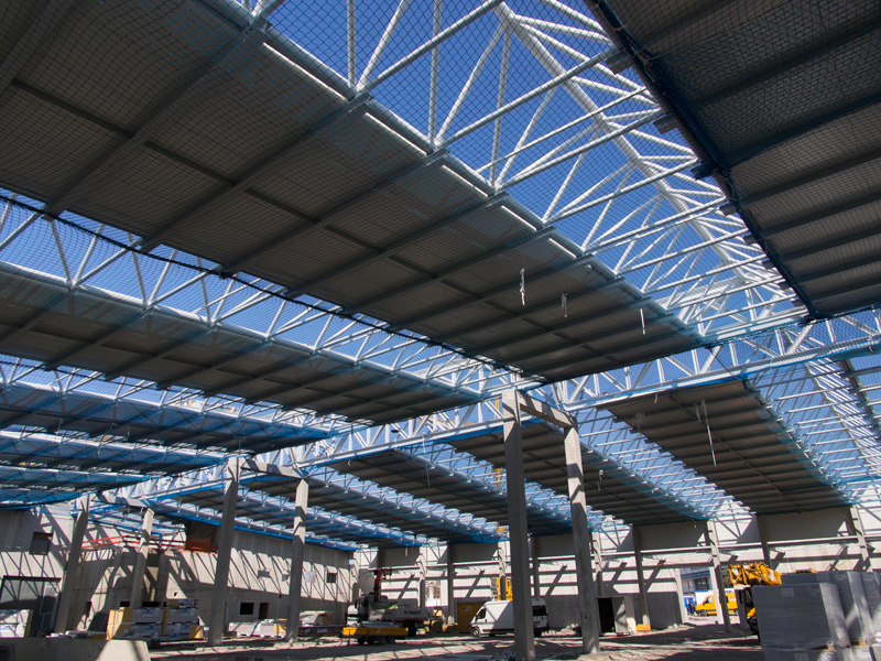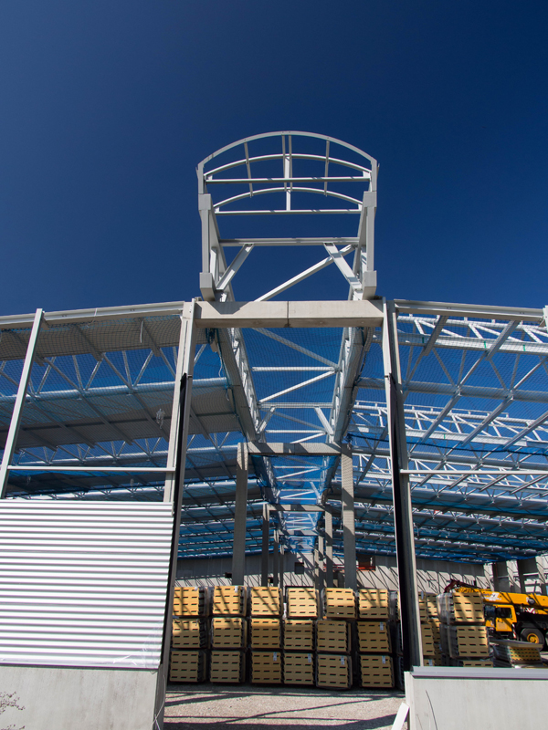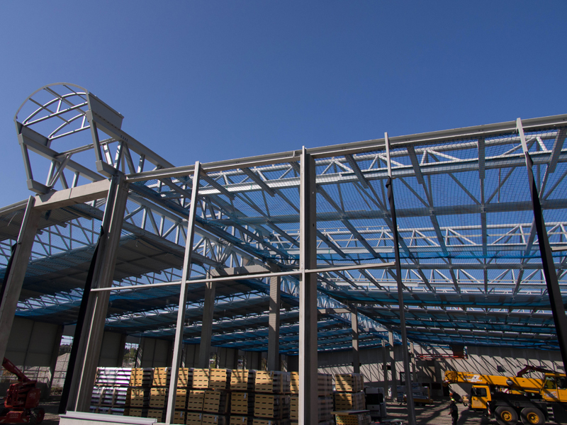 最近几周,BAUER KOMPRESSOREN 新的小型设备工厂建设进程大大加速。建筑起重机没有中断地旋转,以便将其 25 米长的强壮的桁梁架伸到混凝土墩上方的点阵结构中。屋顶建筑工人在保证安全的情况下,在令人眼晕的高度上工作,以便将各个桁梁与整个屋顶支撑结构相连。接着在间隙中通过起重机装入屋顶嵌板。在上部光带安装上玻璃、插入侧壁板以后,很快在第三阶段将开始室内装修。